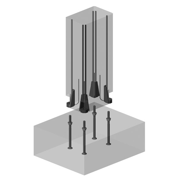 V prípade, že je dĺžka kotevnej časti skrutky obmedzená rozmermi základovej konštrukcie, použijú sa skrutky s rozkovanou hlavou, ktoré majú prenos síl lokalizovaný v mieste hlavy. Tým pádom sú pri rovnakej únosnosti kratšie (300 až 500 mm) ako skrutky s rovnou kotevnou časťou. Stĺpové pätky majú takisto kotevnú a montážnu časť. Tri až štyri výstužné prúty, ktoré sú navrhnuté tak, aby dokázali do stĺpa preniesť ťahovú silu rovnajúcu sa minimálne ťahovej únosnosti závitovej časti, tvoria kotevnú časť. Montážna časť pozostáva z oceľovej platne s kruhovým otvorom, cez ktorý sa pätka nasadí na skrutku. Stĺpové pätky sa umiestnia do debnenia prefabrikátu ešte pred betonážou tak, aby montážna časť ostala prístupná.