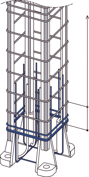 | Osadenie stĺpových pätiek do hlavnej výstuže stĺpa | Montážny postup pri kotvení prefabrikovaného stĺpa |