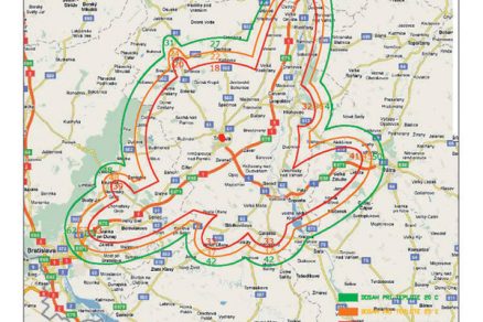 Opačný prístup k problému predstavuje definovanie maximálnej dopravnej vzdialenosti v závislosti od zloženia betónu, teploty prostredia, času začiatku tuhnutia (obr. 2) a prepravnej rýchlosti na jednotlivých komunikáciách tak, aby na stavenisku zostával dostatok času na jeho zabudovanie (uloženie a zhutnenie) v súlade s STN EN 13670. Takýmto prístupom možno pri daných vstupných okrajových podmienkach určiť veľkosť spádovej oblasti každej betonárne (obr. 3). Zohľadnením priepustnosti existujúcej infraštruktúry sa spádová oblasť zdeformuje na reálnejší model spádovej oblasti (obr. 4). Výber dodávateľa čerstvého betónu, a teda aj návrh primárnej dopravy, by mal zohľadňovať polohu betonární vzhľadom na stavenisko, ktoré by sa malo nachádzať v reálnej spádovej oblasti vybranej betonárne.