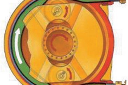 transport,betónPrincíp práce rotačných čerpadiel betónu (obr. 7), nazývaných aj stláčacie (sque­e­ze), sa zakladá na posune čerstvého betónu z násypného koša do sacieho otvoru pomocou hriadeľa s lopatkami. Tu sa čerstvý betón nasáva do pružného polkruhového potrubia umiestneného v priestore rotora čerpadla. Rotor je vybavený najmenej dvomi valcami, ktoré neustálymi pojazdmi (rotáciou okolo osi rotora) po mäkkom potrubí nasávajú a na druhom konci potrubia vytláčajú čerstvý betón. Rotačné čerpadlá dosahujú teoretickú výkonnosť do 40 m3/h pri použití štandardných potrubí s priemerom 75 mm, z čoho vyplýva aj možnosť čerpania len jemnejších zmesí betónu a aj to len na vzdialenosti asi 100 m horizontálne a 35 m vertikálne.
