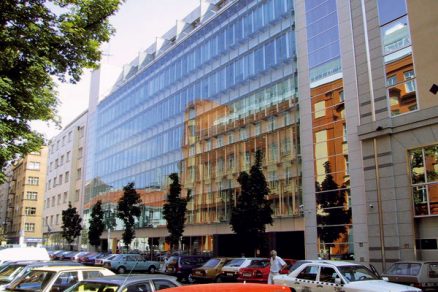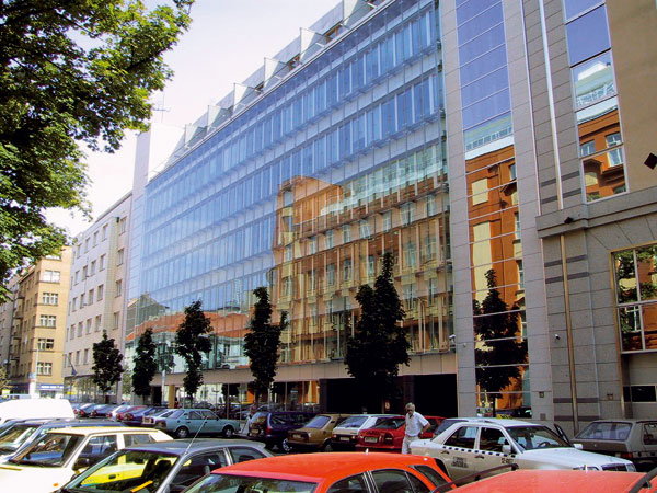 Meranie pomerných deformácií na predpätej stropnej konštrukcii (hrubej 220 mm a zosilnenej v priečnych stĺpových pruhoch) klimatizovanej budovy Komerčného a administratívneho centra v Prahe (obr. 3) prebiehalo od roku 1997 (výstavba budovy) až do roku 2006. Strunové tenzometre sa osadili do stropnej dosky nad 3. NP v pozdĺžnom i priečnom smere. Každý rok sa meralo dvakrát, v júni a v decembri. Namerané hodnoty sa porovnávali s výpočtom. Ukázalo sa, že v prípade sledovanej budovy je zmrašťovanie betónu podstatne väčšie, ako sú hodnoty odporúčané normovým predpisom.