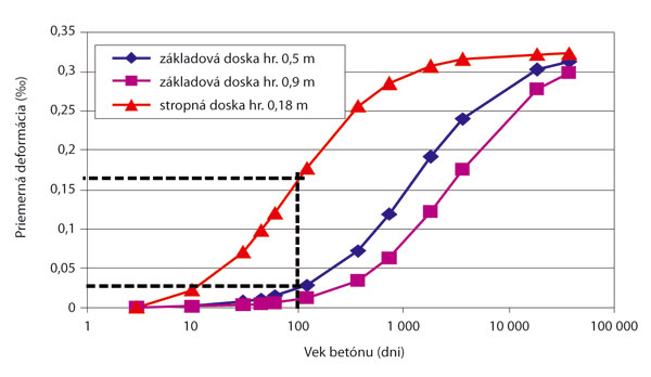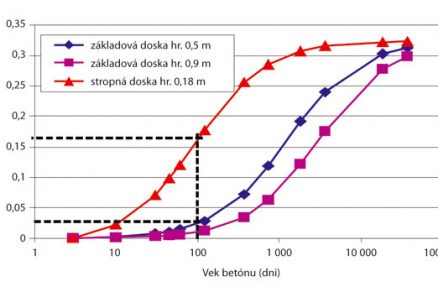 Na obr. 2 je znázornený priebeh zmrašťovania v rôznych doskách. Stropná doska s hrúbkou 180 mm sa zmrašťuje veľmi rýchlo, za 3 mesiace (asi 100 dní) môže prebehnúť takmer 50 % zmrašťovania. Pri základových doskách je podiel zmrašťovania počas prvých 3 mesiacov takmer zanedbateľný. Aj v tomto prípade je návrh zmrašťovacích pásov nevhodný.