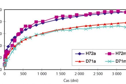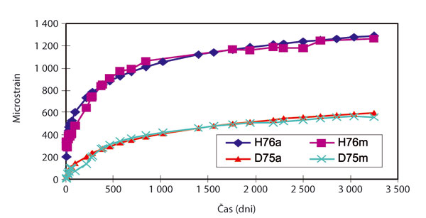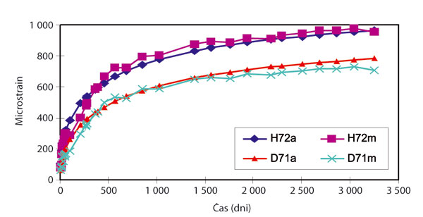 Na obr. 5 je znázornený priebeh pomerných deformácií v pozdĺžnom smere budovy. Napätie od stáleho zaťaženia je pri hornom povrchu asi 2,1 MPa (H72) a pri dolnom povrchu asi 0,7 MPa (D71). Opäť možno pozorovať, ako sa deformácia stále zväčšuje. Z grafu je tiež zrejmé, že nárast deformácií sa prejavuje ešte dlhý čas po dokončení stavby. V tomto prípade napríklad po 3 mesiacoch dosahovala asi 180 mikrostrain, kým po 9 rokoch asi 750 mikrostain (asi 4-násobok).