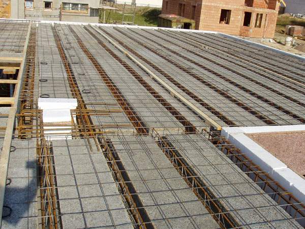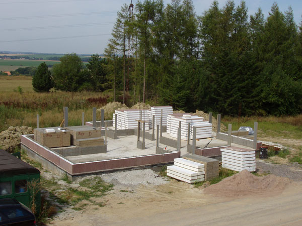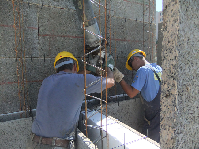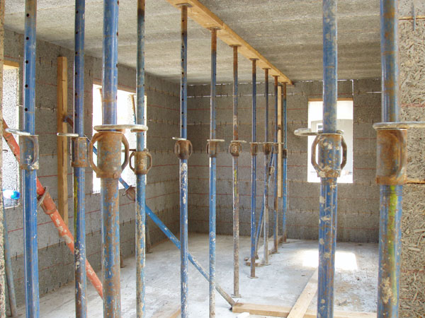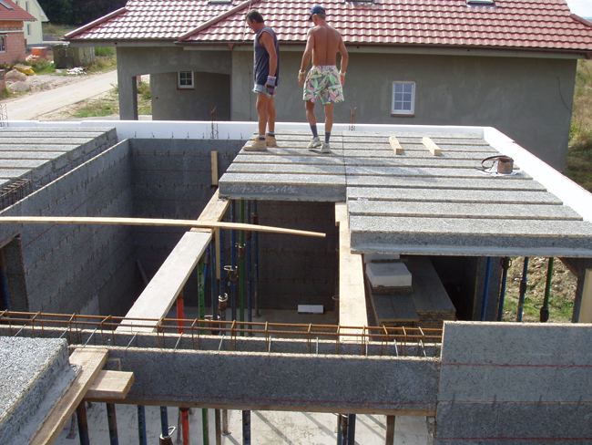 Stručný popis výstavby: Na základovú dosku sa vyznačí pôdorys stavby – obvodové a vnútorné nosné steny , následne sa spájaním dosiek prostredníctvom montážnych spôn zostaví prvý rad debnenia stien (obr. 1) Rohy a spoje jednotlivých dosiek sa spevňujú klincami, nasleduje betonáž 1. radu debnenia. Po zabetónovaní prvého radu pokračuje suchá montáž ostatných radov debnenia stien podlažia (obr. 2). Posledný rad debnenia treba vytiahnuť až na hornú úroveň stropnej konštrukcie. Nasleduje montáž podpornej konštrukcie stropu (obr.3) a montáž rebrového stropu, pri ktorej sa najskôr na podpornú konštrukciu ukladajú stropné prvky a do rebier sa vkladajú priestorové oceľové nosníky (Obr. 5). Ďalším krokom je betonáž celého podlažia (Obr.6).