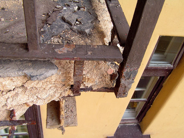 Pri starších betónových konštrukciách z konca 19. storočia už betón nemá dostatočné pH, aby ochránil výstuž (obr. 1). Tu dochádza k masívnej degradácii a pri takýchto konštrukciách je už takmer nemožná oprava s použitím špeciálnych reprofilačných mált. Väčšinou sa odporúča celú konštrukciu demontovať a vybetónovať novú balkónovú dosku. Existujú však aj riešenia, pri ktorých sa zbúrané balkóny nahradili tzv. francúzskym oknom.