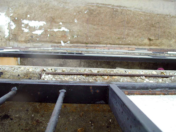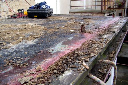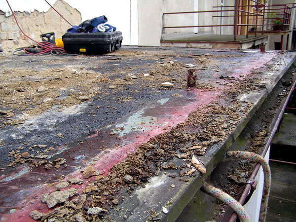 Príčinou poškodenia nosnej betónovej konštrukcie môže byť aj porušená hydroizolácia na hornej strane dosky, následkom čoho dochádza k zatekaniu do konštrukcie (obr. 3). Pri zaťažení snehom pôsobí vodný stĺpec, ide teda o zaťaženie tlakovou vodou. V tomto prípade je nevyhnutná oprava hydroizolačnej vrstvy. Treba odstrániť nášľapnú vrstvu a poškodenú hydroizoláciu vrátane oplechovania. Následne sa odporúča opraviť betónovú dosku, osadiť ukončovacie profily a napojiť hydroizoláciu (obr. 4).