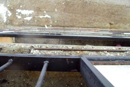 | Obr. 1: Degradovaná balkónová doska z konca 19. storočia bez ukončovacích profilov | Obr. 2: Obnažená výstuž na čele balkónovej dosky | |