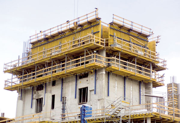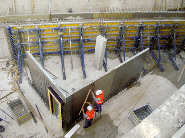 Medzi prvými sa na stavbu dodalo ručné stenové debnenie vysoké 2,4 m, pomocou ktorého sa zhotovila základová doska hrubá 2 m. Na zvislé konštrukcie stien i stĺpov sa použilo veľkoplošné rámové debnenie. Stĺpy kruhového prierezu sa debnili oceľovým debnením s výškou 8 a 13 m a s priemerom 800 mm. Betonáž prebiehala v jednom výškovom zábere. Debnenie stropných dosiek sa riešilo pomocou stropného debnenia i podperného systému, ktoré sa zvolili na základe výšky podlaží, zložitosti tvaru a umiestnenia debnených konštrukcií. Na stavbu sa ďalej dodali tieto systémy: skladacie plošiny, schodisková veža a bezpečnostné prvky.