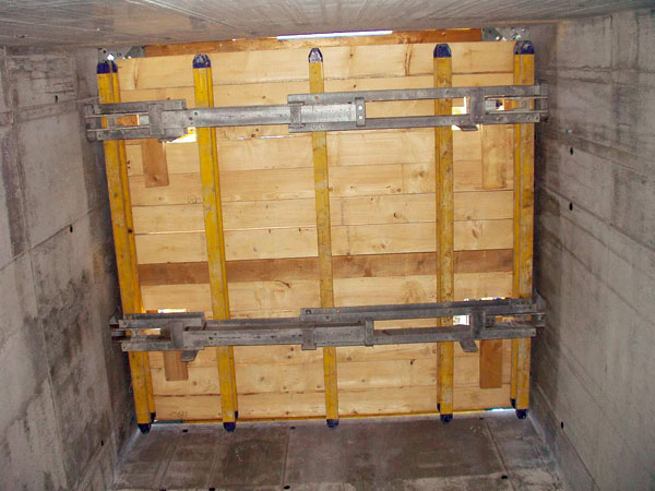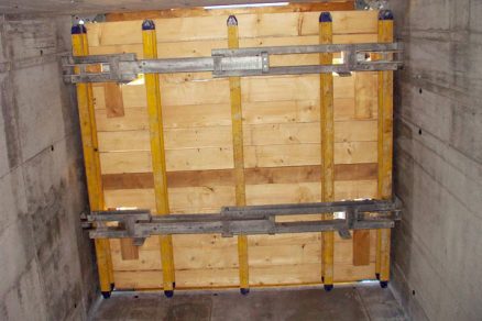 | Pohľad na samošplhacie debnenie |  Jednostranné debnenie steny opornými kozami  |