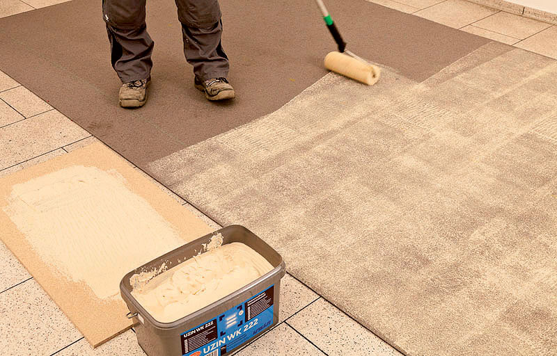 Na podklad a podlahovinu sa hrubým žltým penovým valčekom rovnomerne nanesie tenká vrstva bezrozpúšťadlového lepidla. Rohy a hrany podlahoviny sa natrú pomocou silikónového štetca. Odporúča sa naniesť lepidlo najprv na drevotrieskovú dosku, aby sa dosiahlo rovnomerné zvlhčenie valčeka.