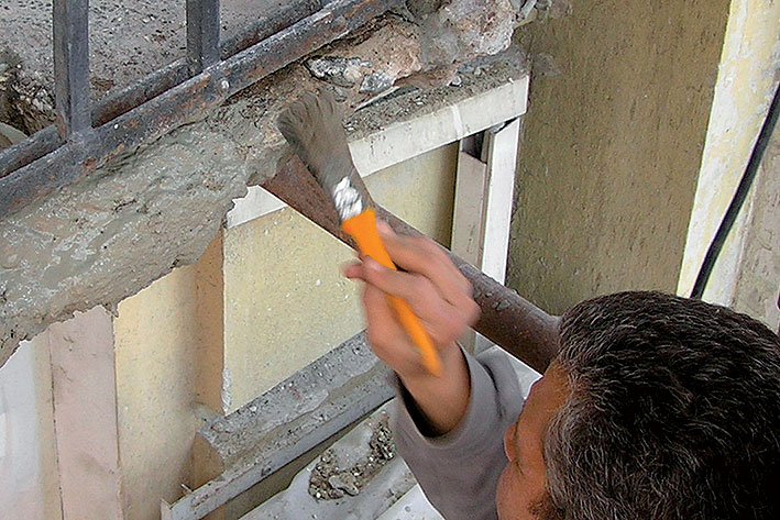 Následne sa celý podklad očistí vysokotlakovým prúdom vody, aby sa z povrchu odstránil prach a iné nečistoty, čím sa dosiahne dobrá priľnavosť vrstiev sanačného systému. Bezprostredne po očistení povrchu výstuže a oceľových prvkov sa aplikuje ochranný náter proti korózii. Povrch oceľovej výstuže musí byť bez mastnoty, olejov, hrdze, zvyškov náterov a nečistôt. Obsah balenia ochranného náteru sa zmieša v čistej nádobe s vodou (približne 0,44 l/2 kg) pomocou elektrického miešadla s nízkymi otáčkami – vznikne homogénna zmes bez hrudiek (čas miešania: približne 3 minúty). Antikorózny náter sa nanáša pomocou štetca v dvoch vrstvách. Druhá vrstva sa nanáša v inom smere ako prvá vrstva náteru po približne šiestich hodinách. Celková hrúbka antikorózneho náteru musí byť minimálne 1 mm. Deň pred nanášaním adhézneho mostíka je potrebné podklad ešte raz dostatočne navlhčiť vodou, aby sa zabezpečilo dokonalé spojenie mostíka s podkladom.