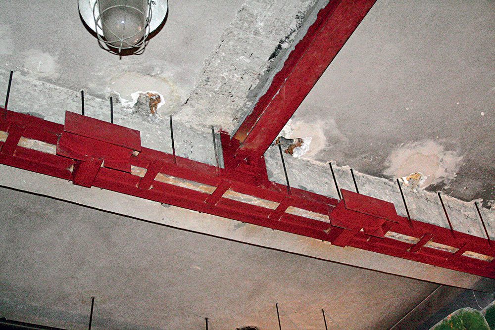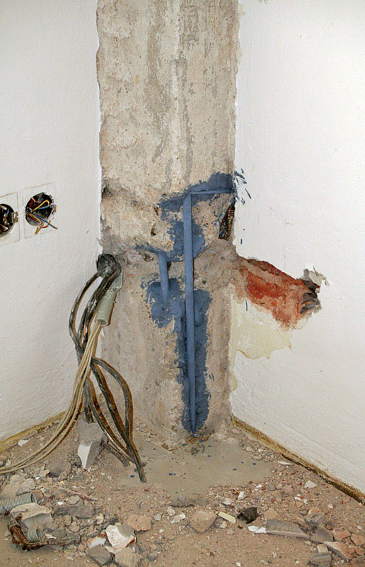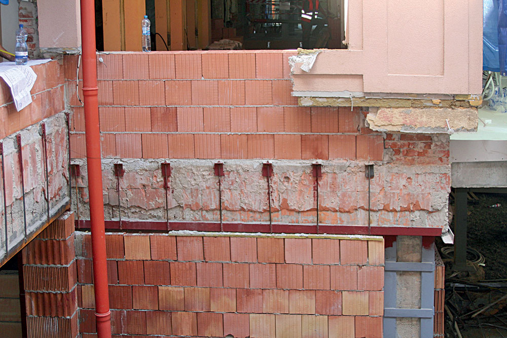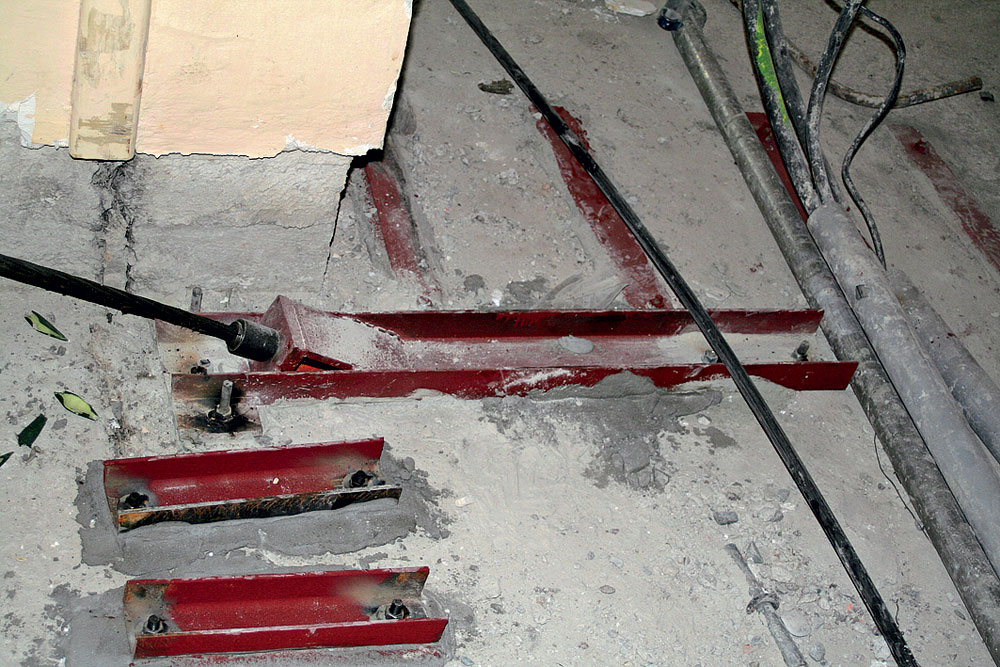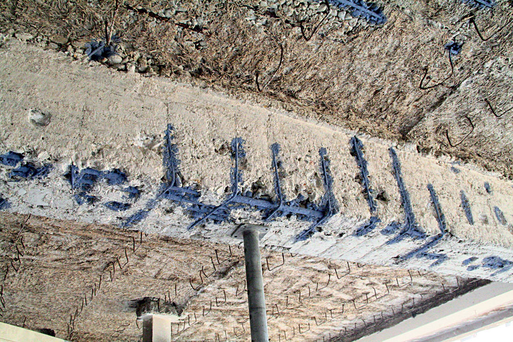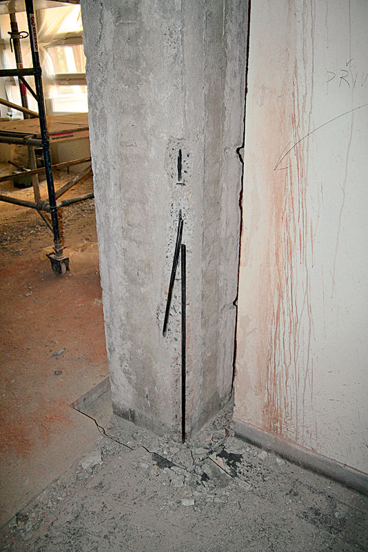 V nosnej konštrukcii sa vizuálnou kontrolou nezistili závažné statické poruchy (deformácie alebo trhliny). Postupné odstraňovanie omietok však viedlo k odhaleniu porúch, vlasových trhlín a nedostatkov v kvalite použitého betónu, resp. k odhaleniu nepresného uloženia výstuže a nešetrných zásahov do nosnej konštrukcie (obr. 2).