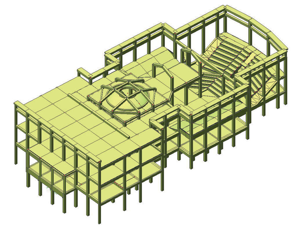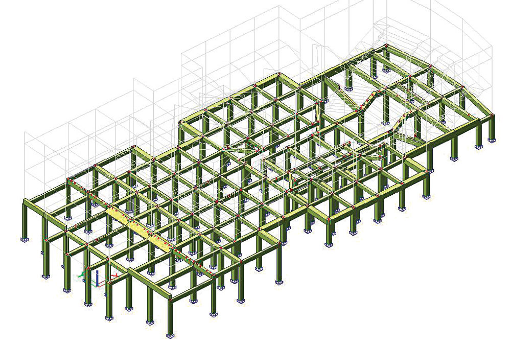 Na základe ekonomických, statických a technických aspektov (čo najmenšie ďalšie priťaženie konštrukcie) sa zvolil variant s použitím oceľovej bandáže s dodatočným externým predpätím väčšiny prvkov. V prípade niektorých prievlakov sa navrhli podperné oceľové nosníky, resp. v prípade masívnych a málo zaťažených prievlakov sa počíta iba s bandážou. Na podrobné statické posúdenie sa vytvoril priestorový výpočtový model nosnej konštrukcie budovy a riešil sa metódou konečných prvkov (MKP) (obr. 3).