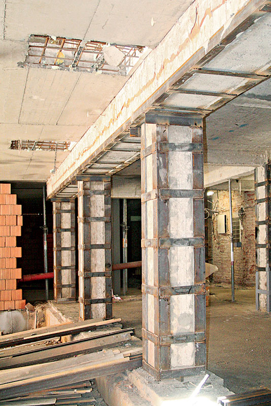 Z výsledkov prieskumu vyplýva, že v prípade stĺpov, ako aj prievlakov v rámci riešeného 1. NP (a niektorých stĺpov 2. NP) má betón veľmi nízku pevnosť v tlaku (trieda betónu od C 3/3,5 do C 9/12,5), o ktorej sa v EN 1992 ani neuvažuje (najnižšia trieda betónu sa uvádza C 12/15). Ak by sa aj uvažovali také nízke hodnoty pevnosti betónu, množstvo stĺpov nespĺňa požiadavky ČSN EN 1922-1-1 Eurokód 2: 2006 (Navrhování betonových konstrukcí – Část 1-1: Obecná pravidla a pravidla pro pozemní stavby) na medzný stav únosnosti. Preto sa v prípade všetkých stĺpov a prievlakov na úrovni 1. NP navrhla oceľová bandáž.