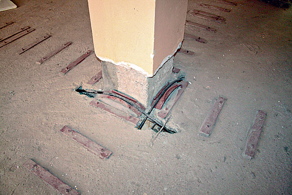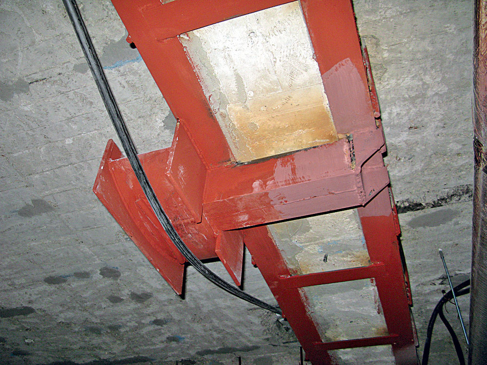 Vzhľadom na nízku pevnosť betónu prievlakov sa musela realizovať aj bandáž väčšiny prievlakov, a to po vyhotovení bandáže stĺpov. Bandáž prievlaku sa vždy ukladá na bandáž stĺpov v stykoch stĺpov a prievlakov – je zabezpečený prenos časti zaťaženia z prievlakov do bandáže stĺpov (obr. 4).