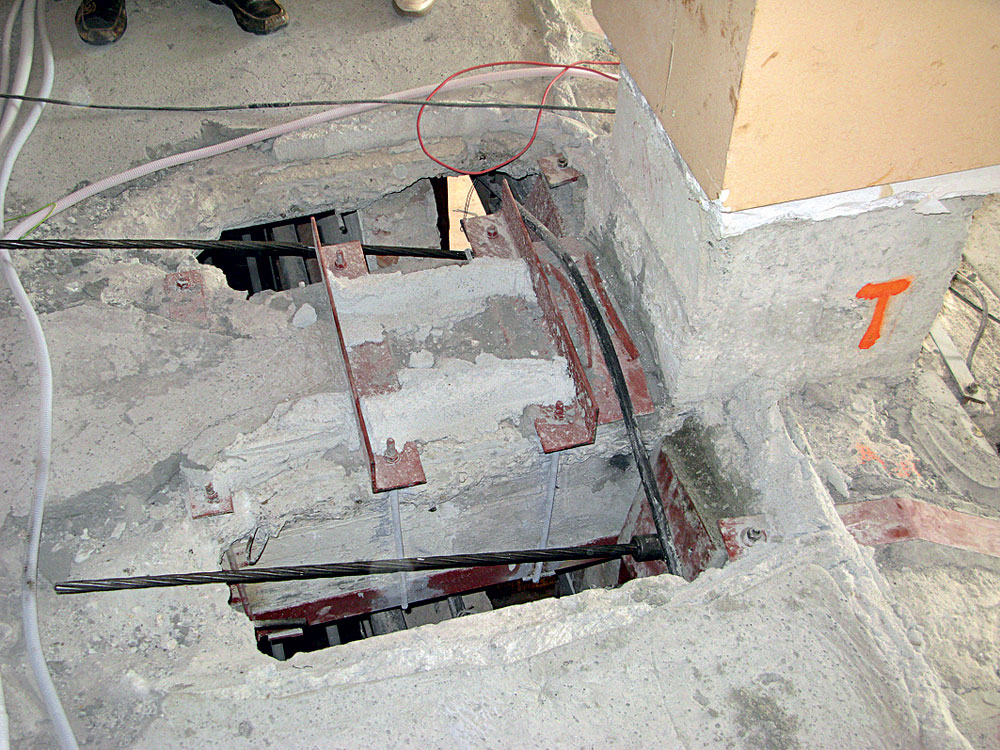 Predpínacie sily na jedno lano sú v rozpätí 70 kN v prípade lán zosilňujúcich kratšie prievlaky a až 100 kN v prípade lán zosilňujúcich nosníky s dlhšími rozpätiami. Tieto laná sa napínali vo dvoch fázach, druhá fáza napínania sa vykonala až po zhotovení podláh (obr. 10).