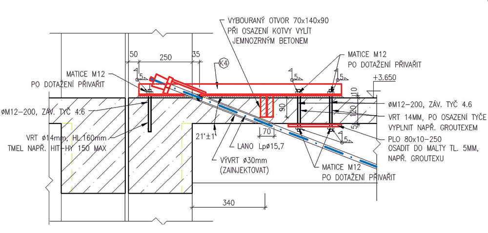 Lano sa väčšinou kotvilo do masívnych obvodových prievlakov (obr. 8). Iba v prípade nepriebežných lán sú kotvy osadené na vnútorných prievlakoch vo výške nadväzujúcej železobetónovej dosky. Na miestach výškových zmien stropnej konštrukcie sa muselo navrhnúť prekotvenie lán (obr. 9).