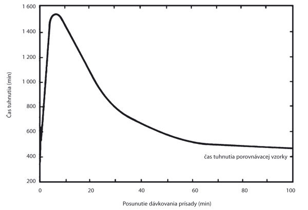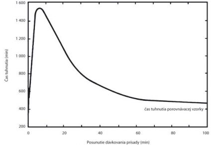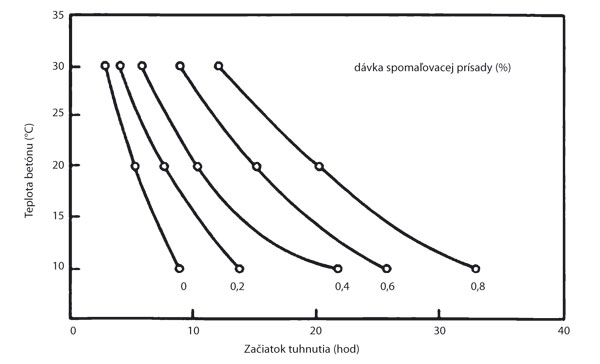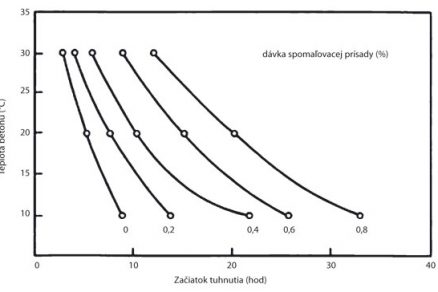 - Keďže spomaľovacie prísady sa často používajú pri zvýšených teplotách, treba poznamenať, že s nárastom teploty sa spomaľovací účinok prísady zmenšuje a niektoré prísady pri vyšších teplotách môžu dokonca účinnosť stratiť (obr. 2).