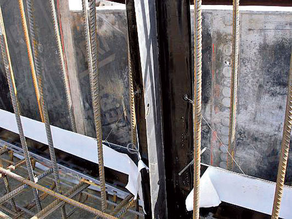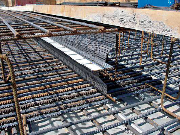 Pred inštaláciou sa z obidvoch strán tesniaceho krížového plechu stiahne krycia fólia. Následne sa vloží v mieste plánovanej škáry medzi pripravenú výstuž tak, aby zoslabovacie lišty smerovali naprieč stenou a plech s bitúmenovou vrstvou pozdĺžne so stenou, pričom by sa mal po vybetónovaní nachádzať uprostred steny (obr. 4). Krížový plech sa potom zafixuje pomocou vstavaných U-hákov alebo S-hákov viazacím drôtom, a to cez otvory vyhotovené v pozinkovanom plechu (obr. 5). Ďalší diel sa priloží k voľnému koncu plechu s bitúmenovou vrstvou. Dielce sa spoja pevným stlačením. Prepojenie dielcov musí mať minimálny presah 5 cm. Celý spoj musí byť dôkladne zlepený. Na vyhotovený spoj sa ešte nasunú dve styčné spojky, a to z obidvoch strán.