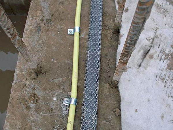 Inštalácia bentonitového tesnenia je jednoduchá a časovo nenáročná. Tesnenie sa kladie na stred škáry, minimálne 8 cm od okraja betónovej konštrukcie, na čistý podklad. Upevnenie tesnenia sa realizuje pomocou kovovej krycej mriežky (obr. 9), ktorá sa pripevní klincami vo vzájomnej vzdialenosti približne 25 cm. Mriežkou sa zabezpečuje celoplošný kontakt s betónovým podkladom. V prípade menej exponovaných škár, ťažko prístupných miest alebo hladkých plôch možno nalepiť tesnenie pomocou špeciálnej pasty.