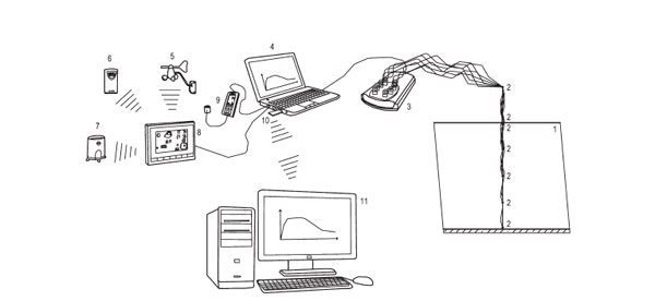 1 – betónová konštrukcia, 2 – termočlánok, 3 – datalogger, 4 – minilaptop, 5 – anemometer, 6 – teplomer a vlhkomer, 7 – zrážkomer, 8 – meteostanica, 9 – solarimeter, 10 – modem, 11 – centrálny počítač