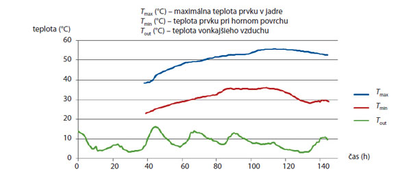 Teplota po hrúbke prvku sa merala na piatich úrovniach s cieľom zmerať vývoj teplôt čo najpresnejšie. Na meranie teploty sa použili termočlánky (typ K) a datalogger (Pico T-08) napojený na počítač (obr. 2). Teploty v jednotlivých meraných bodoch sa odčítali každú hodinu počas šiestich dní.