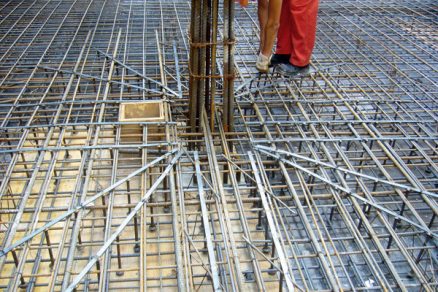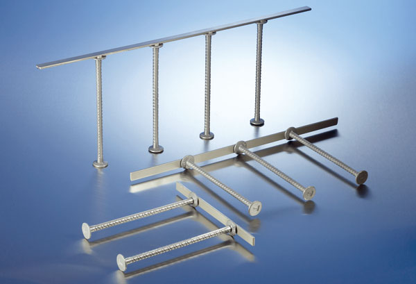 Výstuž zo šmykových tŕňov s rozkovanou hlavou používaná na zosilnenie dosky proti pretlačeniu je znázornená na obr. 4. Tŕne sa štandardne vyrábajú z betonárskej výstuže Bst500s. Priamo v dielni sú navarené na dištančnú lištu, čo umožní na stavbe dodržať ich požadovaný rozstup. Hlava tŕňov sa vytvorí rozkovaním výstuže na oboch koncoch. Tŕne možno do dosky osadiť buď zavesením na ohybovú výstuž, alebo uložením cez plastové podložky priamo do debnenia dosky (obr. 5).