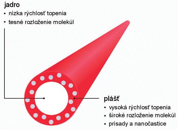 Vďaka významnému pokroku v oblasti nanotechnológií za uplynulé desaťročie možno vyrábať vlákna do betónu aj na báze uhlíka a rôznych polymérov. Ako skutočný prevrat sa javia dvojzložkové polymérové vlákna. Novou technológiou výroby vlákien pozostávajúcich z jadrovej časti a z plášťa (s rôznymi úpravami, obr. 7) sa dajú dosiahnuť mechanické vlastnosti polymérových vlákien, aké v prípade klasických termoplastov dosiaľ neboli možné. Vylepšené mechanické vlastnosti vylučujú nevýhody, ktoré majú oceľové vlákna [5]. Výsledky skúšok na vláknobetónových vzorkách s použitím dvojzložkových vlákien prezentovali v roku 2009 laboratóriá EMPA. Z výsledkov vyplýva 10- až 15-krát vyššia súdržnosť s cementovým tmelom v porovnaní s tradičnými polymérnymi vláknami a možnosť bezpečnej náhrady dávky 30 kg/m3 oceľových vlákien za dávku 5 kg/m3 dvojzložkových vlákien [5].
