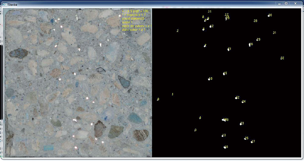 TSÚS participoval na už spomínanom projekte Fiberdist. Projekt sa zameral na zostro­jenie a overenie funkčnosti nástroja na fotogrametrické hodnotenie rovnomernosti rozptýlenia (distribúcie) vlákien v betóne, ako súčasti spracovávanej metodiky skúšania. Vytvoril sa softvérový nástroj na analýzu a zber dát z digitálnych snímok priečnych rezov vláknobetónu, v ktorom sa identifikujú oceľové vlákna, ich počet a poloha. Funkčnosť a spoľahlivosť vrátane numerického stanovenia rovnomernosti distribúcie vlákien sa v týchto dňoch testuje na verzii beta, pričom sa na hodnotenie používa 60 vzoriek (priečnych rezov – obr. 10 a 11).