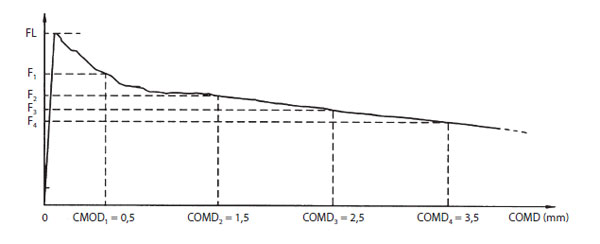 Reziduálna pevnosť v ťahu pri ohybe fR (po vzniku trhliny v celom priereze) sa stanovuje pri jednotlivých deformačných stupňoch takzvaných CMOD (crack mouth opening displacement – obr. 2). Integrovaním výsledného spojitého pracovného diagramu sa sekundárne získa obraz o schopnosti telesa absorbovať zaťažovaciu energiu, čo vyjadruje tuhosť kompozitu [2]. Ovplyvňuje ju v prvom rade množstvo pridaných vlákien vyjadrené zvyčajne hmotnostnou dávkou ČB (kg/m3). V zásade platí jednoduchá úvaha, že čím je dávka vlákien vyššia, tým viac ich je vhodne orientovaných na prenos zaťaženia, a teda pôsobia ako výstužové elementy umožňujúce zmenšiť hrúbku vláknobetónovej konštrukcie [1]. Vplyv dávky vlákien sa hodnotil na dávkach s hmotnosťou 20 a 25 kg/m3 veľmi podobných vlákien (nie však úplne totožných). Výsledky sú zachytené na obr. 8. Porovnaním vzoriek s rovnakými značkami sa zistilo zvýšenie reziduálnej pevnosti v ťahu pri CMOD 3,5 mm o 0,26 až 0,39 MPa, čo predstavuje relatívnu zmenu o 14 až 30 %.