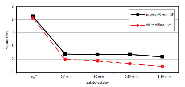 Reziduálnu pevnosť ovplyvňuje aj tvar vlákien. Vychádzalo sa z predpokladu, že zložitejší tvar vlákien zabezpečuje ich lepšie zakotvenie v cementovom tmele, čiže vyššie výsledné fR. V prípade vlnovkových vlákien v porovnaní s priamymi s prostými s háčikmi na koncoch (obr. 4) sa očakávali vyššie reziduálne pevnosti. Porovnanie výsledkov skúšok na vláknach priamych a vlnitých v dávkach 25 kg/m3 podľa obr. 9 viedlo k prekvapivému záveru. Vlnité vlákna vykazovali počas celej skúšky o 17 až 34 % nižšie reziduálne pevnosti ako priame vlákna s háčikmi a s rastúcim CMOD sa fR znižovalo čoraz rýchlejšie. Predpokladá sa, že výsledok možno vysvetliť vyrovnávaním zvlneného tvaru vlákien, no zatiaľ je to len domnienka.