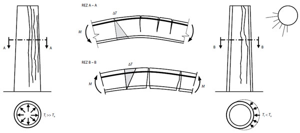 Obr. 1 Vznik zvislých trhlín v drieku komína od teplotného spádu
