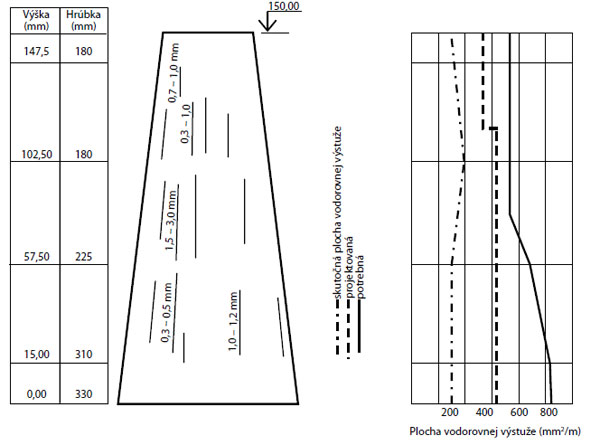 Obr. 2 Priebeh a šírka trhlín na rozvinutom povrchu drieku komína, porovnanie skutočnej, projektovanej a potrebnej plochy vodorovnej výstuže