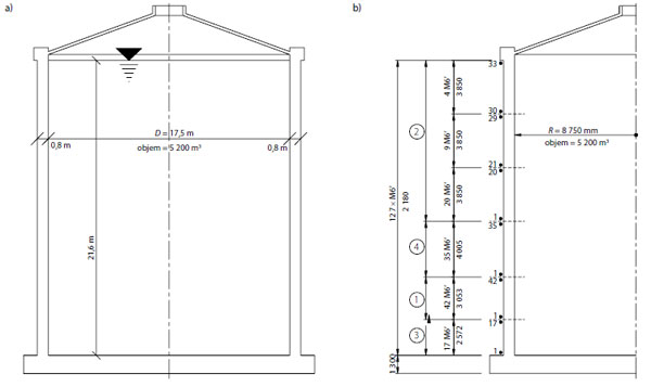 a) schéma vyhnívacej nádrže, b) rozmiestnenie predpínacích lán po výške steny