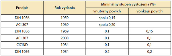 Šírku zvislých trhlín a veľkosť napätia výstuže v trhline možno kontrolovať druhom, množstvom, priemerom a tvarom povrchu vodorovnej prstencovej výstuže. Navyše sú ovplyvnené aj pevnosťou betónu, hrúbkou steny a krycej vrstvy. V tab. 1 je uvedený prehľad o vývoji požiadaviek na minimálny stupeň vystuženia komínov vodorovnou prstencovou výstužou v zahraničných normových predpisoch.