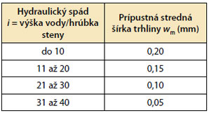 Vodonepriepustnosť betónu ohrozujú predovšetkým trhliny prechádzajúce cez celý prierez (deliace trhliny). Kým podľa ČSN 73 1209 [6] boli v prípade vodonepriepustných betónových konštrukcií prípustné iba čiastočné trhliny, tak podľa EN 1992-3 [7] sa v prípade nádrží pripúšťajú aj deliace trhliny. Je to dôsledok overeného samoutesňovania trhlín, ak sú na to vytvorené priaznivé podmienky. Prípustné šírky deliacich trhlín sú uvedené v tab. 2.