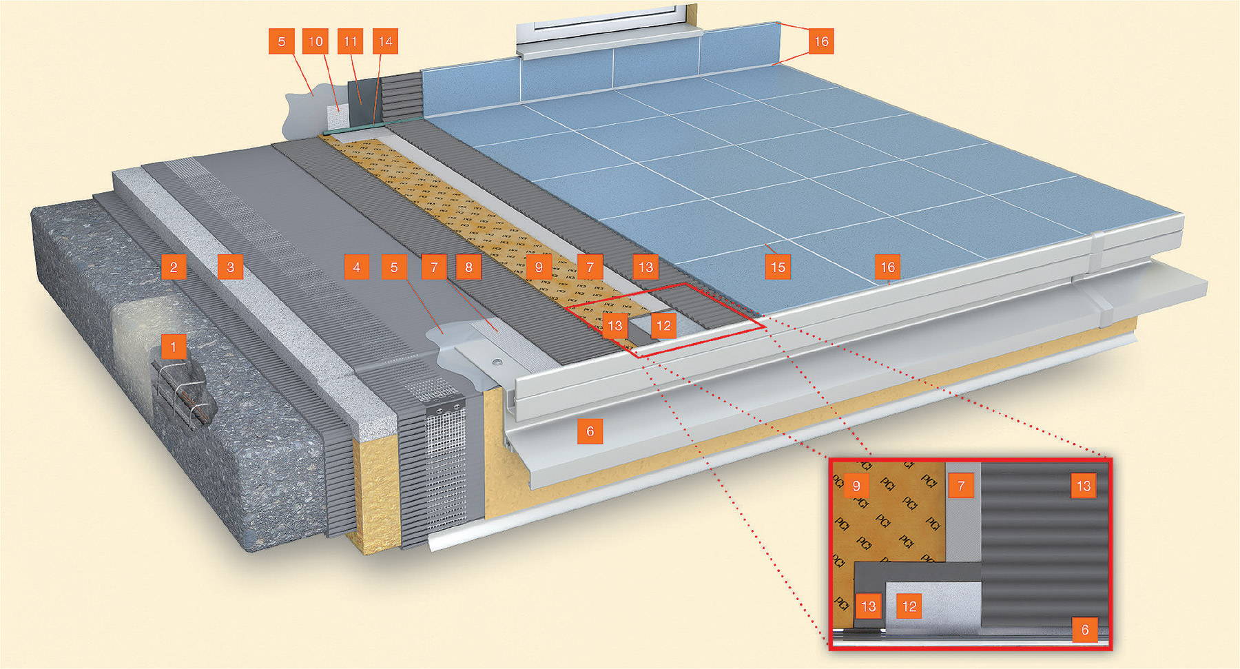 | 1 balkónová konštrukcia opravená PC I Polycret® K 40 a výstuž ošetrená PCI Nanocret® AP 2 lepiaca malta PCI Multicret® Super 3 spádový klin z podlahového stabilizovaného polystyrénu EPS 150 S (alt. EPS 200 S) 4 stierka PCI Multicret® Super s vloženou výstužnou tkaninou, min. 160 g/m2, min. hrúbka 3 mm 5 penetrácia PC I Gisogrund® PGM 6 systémový balkónový profil PCI a príslušenstvo 7 tesniaca a spojovacia páska PCI Pecitape® Butyl 8 flexibilná lepiaca malta PCI Pericol® Fluid – trieda C2FE S1 9 hydroizolačný a oddeľovací pás PCI Pecilastic® U 10 tesniaca páska PCI Pecitape® Butyl 11 hydroizolačná stierka PCI Seccoral® 12 difúzna páska PCI Pecitape® DB 13 flexibilná lepiaca malta PCI Pericol® Fluid – trieda C2FE S1 14 polyetylénový výplňový profil PC I DIN-Polyband 08 15 škárovacia malta PCI Nanofug® Premium, sivá – trieda CG2 WA 16 polyuretánový tmel PC I Elritan® 140 |