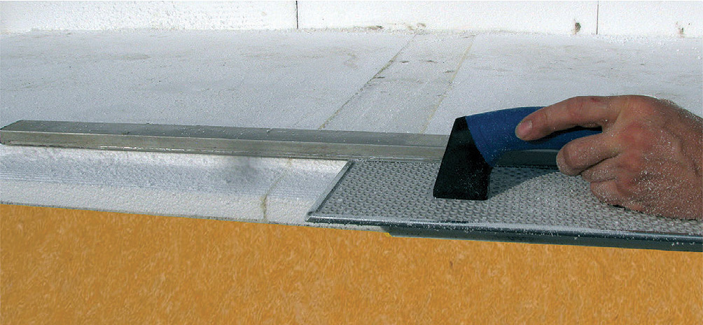 ozubenou stranou (zub 10 × 10 mm) nanesie lepiace lôžko. Tepelnoizolačné dosky sa kladú