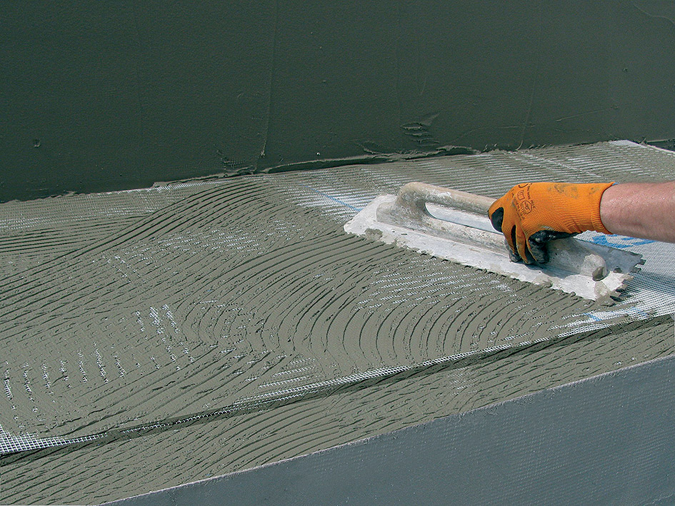 Po dostatočnom vyzretí podkladu (výstužná vrstva, približne 48 hod.) sa v rovnomernej vrstve nanesie flexibilné rýchlotvrdnúce cementové lepidlo ozubeným hladidlom (zub 6 × 6 mm). Lepidlo se nesmie dostať do drenážneho žliabku v odkvapovom profile.