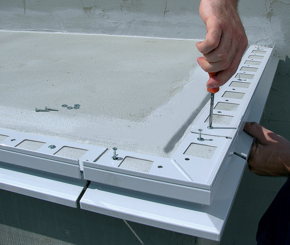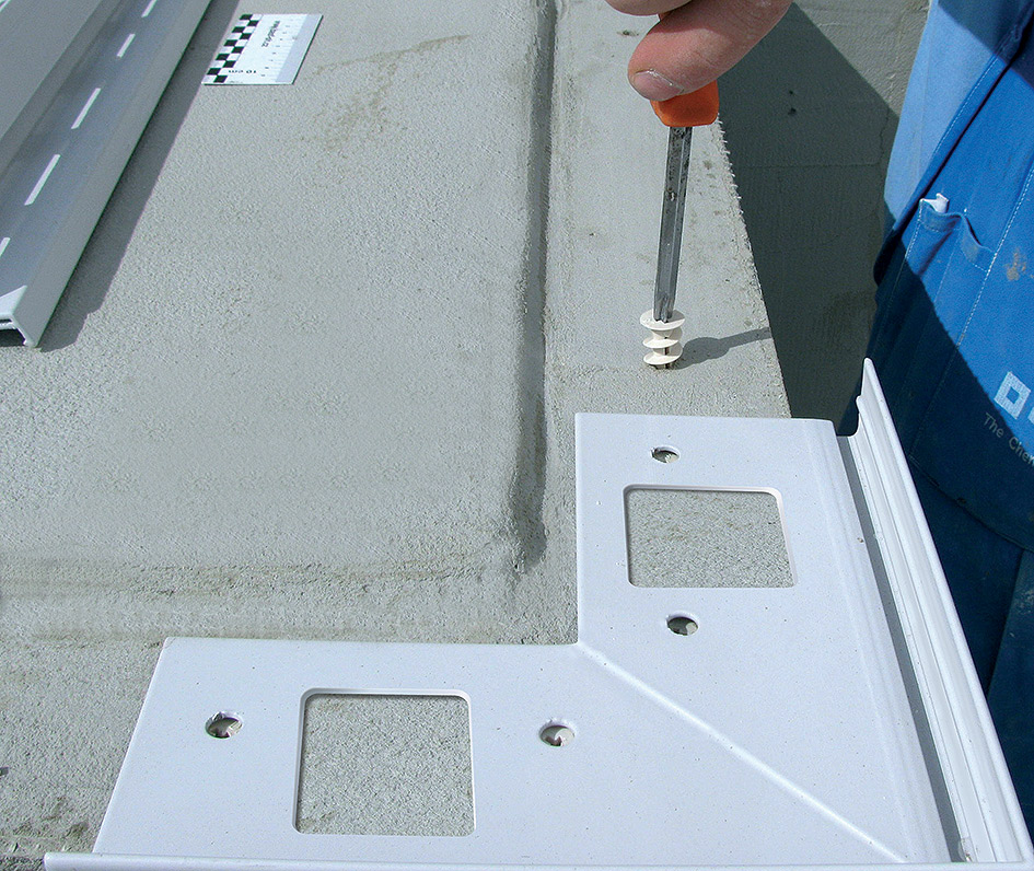 Profily sa odstránia, upevnia sa plastové kotvy a penetračnym náterom sa napenetrujú polodrážky po celom obvode balkóna. Potom sa začne skladať zostava od rohov a postupne sa zafixuje skrutkami. Zafixovaná osadzovacia plocha profilov sa po celom obvode zvrchu prelepí samolepiacou butylovou páskou, vždy s dostatočným napojením na výstužnú vrstvu na ploche.