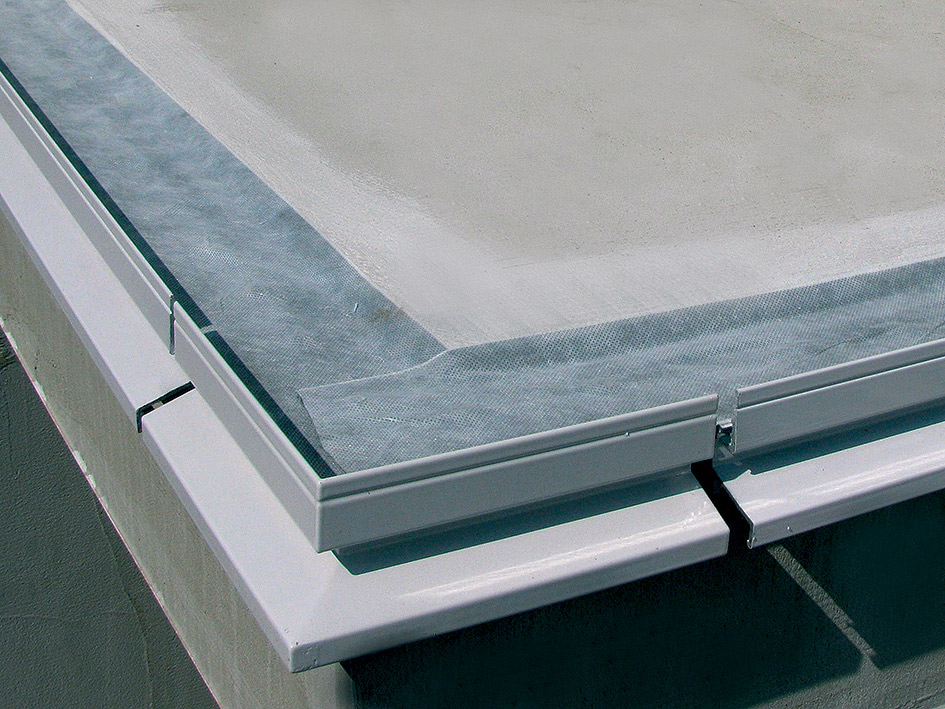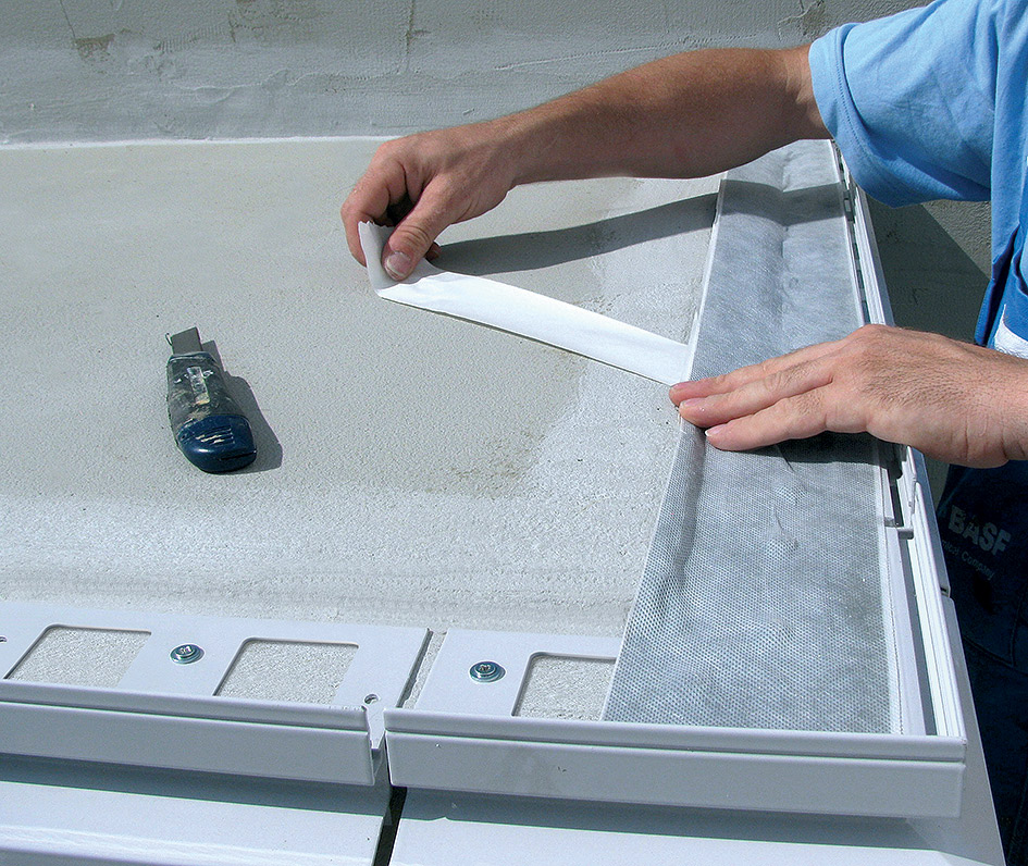Aby sa drenážny žliabok nezaniesol lepidlom, treba nalepiť po obvode na vnútornej strane odkvapového profilu difúznu pásku, ktorá zabráni vniknutiu lepidla do žliabku pri zachovaní vysokej difúznej schopnosti. Páska sa vlepí do vopred nanesenej tenkej vrstvy flexibilného rýchlotuhnúceho cementového lepidla.
