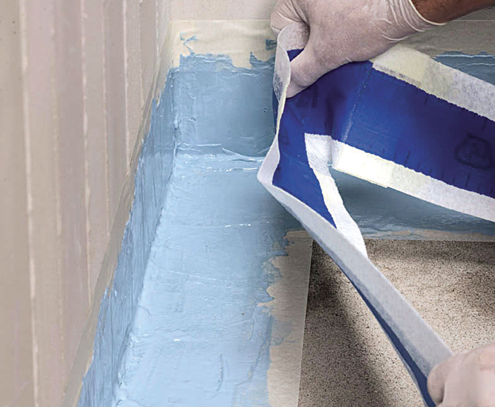 Obr. 2 Nalepenie izolačnej tesniacej pásky do rohov kúpeľne ako súčasť hydroizolačného systému.