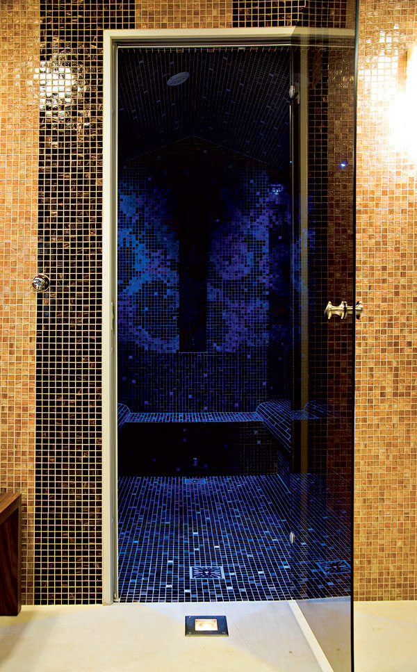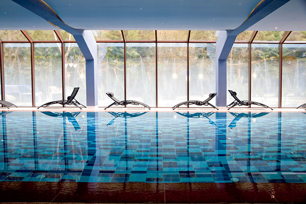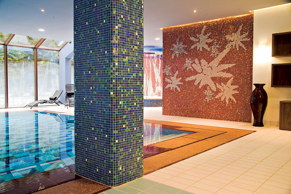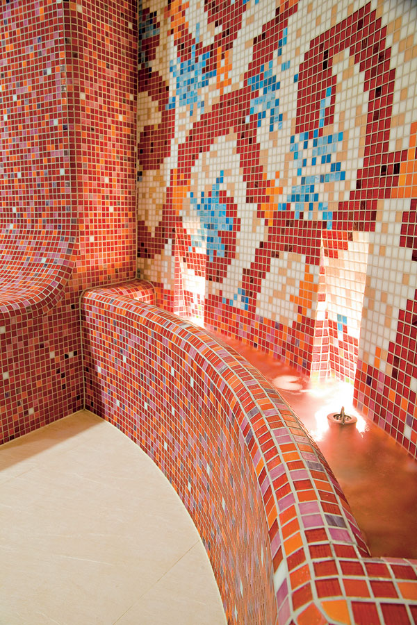 V konštrukcii bazéna sa ako výplň extrémne namáhaných dilatácií – vyústení bazénovej technológie (dýzy, svietidla a podobne) – použil dvojzložkový epoxidový tmel s reakčnou živicou. Hydroizolačná vrstva sa zhotovila z rovnakého materiálu a rovnakým spôsobom ako vo zvyšných častiach wellness centra. Obklady v bazéne sa lepili cementovým lepidlom, ktoré po zmiešaní s vodou nadobudlo vhodnú konzistenciu na aplikáciu na zvislých plochách. Na finálne úpravy sa použil epoxidový škárovací materiál. Pre svoju mimoriadnu odolnosť sa odporúča použiť na miestach, v ktorých pôsobí chemicky upravovaná voda alebo hrozí nadmerné znečistenie.