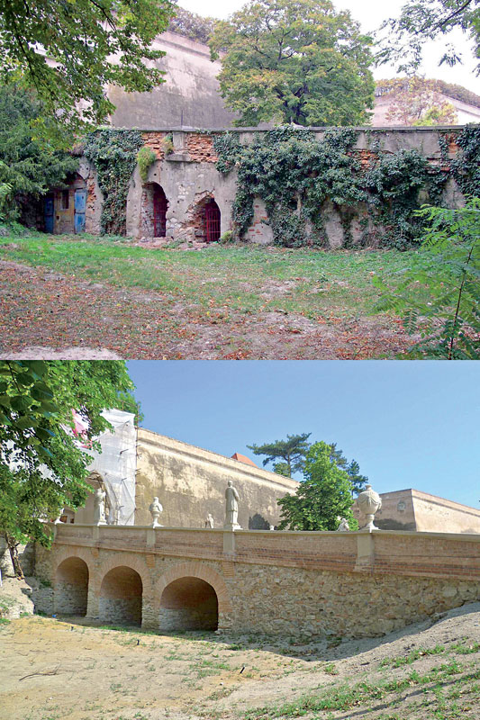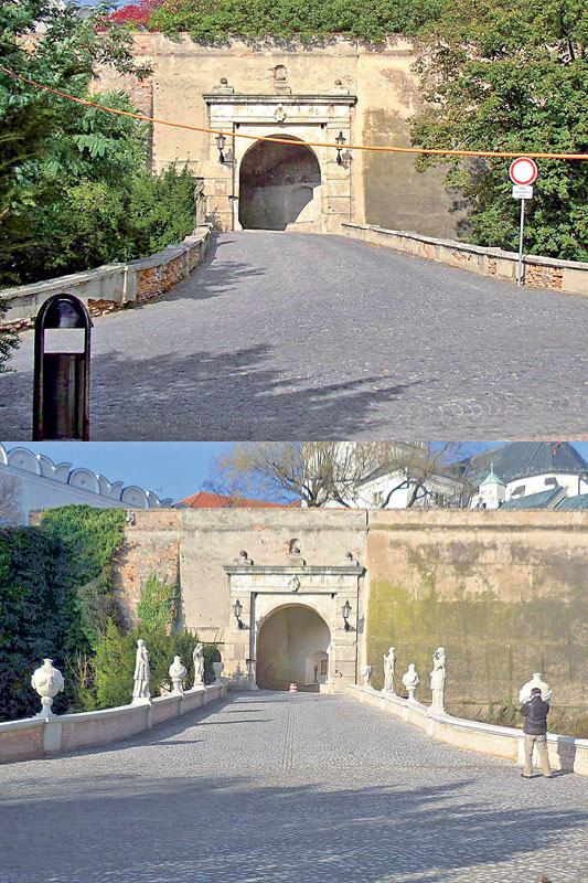 | Obr. 1 Prístupový most – pohľad z juhovýchodu; situácia v roku 2005 a v roku 2012 | Obr. 2 Podopretie hlavnej klenby dvojpoľovou murovanou klenbou |