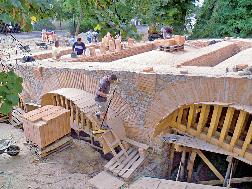 Klenby sa nanovo premurovali s použitím vybraných tehál a vápenného spojiva (obr. 4). S ohľadom na vysokú kvalitu realizačných prác ostali nateraz tehlové klenby (a aj zábradlia) bez omietok. Bola by škoda prekryť dôkaz vysokej remeselnej fundovanosti a zručnosti súčasných majstrov.