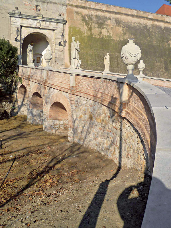 Na opravu podstavcov a korunu múrikov sa použil kameň (zhodný materiál ako pôvodný), sčasti sa reštaurovali pôvodné podstavce. Na bočné kamenné podstavce sa vo finále umiestnili kópie sôch a dekoračných váz.