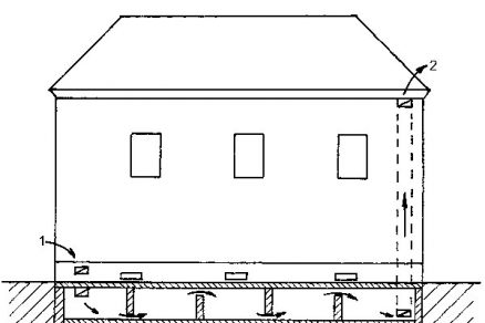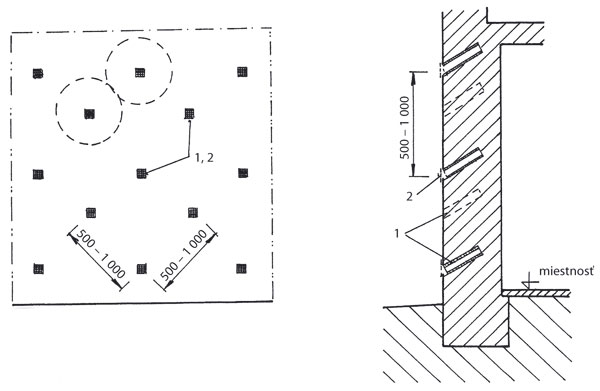 Na vonkajšej strane muriva sú navŕtané šikmé kanáliky so sklonom 10 až 15°, do ktorých sa vyparuje vlhkosť z ostatných častí. Vzduch v kanálikoch sa nasýti, ochladí, stane sa ťažším a vyteká spodnou časťou kanálika von. Cirkulácia sa neustále opakuje, a to tým rýchlejšie, čím je vzduch vonku suchší. Kanáliky sú od seba vzdialené 50 až 100 cm, podľa množstva vlhkosti v murive. Do každého sa vyparuje vlhkosť z plochy ohraničenej polomerom asi 50 cm, a preto by sa tieto kružnice mali navzájom čiastočne prekrývať. Od vnútorného líca muriva majú byť kanáliky vzdialené približne 20 cm. Do navŕtaného kanálika sa osadí drenážna rúrka s priemerom 5 až 6,5 cm. Na lícnej strane muriva sa kanáliky prekryjú sieťkami z pozinkovaného drôtu alebo dierovaného hliníkového plechu. Konce kanálikov možno spojiť priebežnými vodorovnými kanálikmi pozdĺž vnútorného líca muriva, vďaka čomu sa urýchli výmena vzduchu a zlepší sa vysušovanie muriva. Riešenie je znázornené na obr. 6.