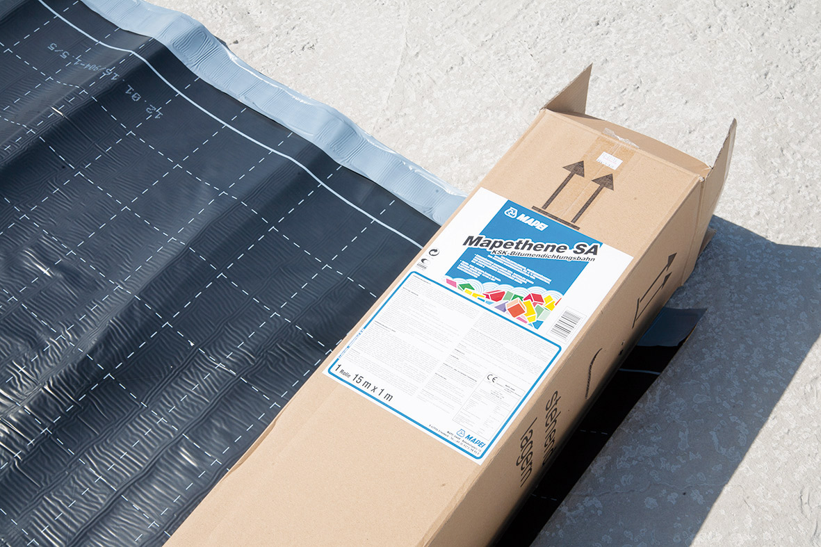 Z povrchu bitúmenových tesniacich pások sa odstránia ochranné pásy až tesne pred nalepením hydroizolačnej fólie. Samolepiaca hydroizolačná fólia sa zreže ostrým nožom na potrebný rozmer. Pred nalepením pásu sa z hydroizolačnej fólie odstráni približne 300 mm ochranného papiera a pás hydroizolačnej fólie sa nalepí na podklad. Nalepená hydroizolačná fólia sa dôkladne pritlačí a stiahne sa zvyšný ochranný papier.