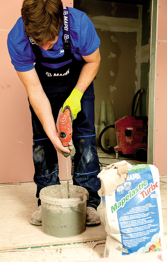 Do dilatačnej škáry sa musí tesniaca páska uložiť v tvare písmena Ω. Na utesnenie rohov sa odporúča použiť rohové profily 90° (vnútorný roh) alebo 270° (vonkajší roh). Spoje medzi páskami sa musia zlepiť lepidlom na báze syntetických živíc. Následne možno na pripravený podklad celoplošne naniesť hydroizolačnú maltu. Najskôr sa hladkou stranou stierky nanesie veľmi tenká (nulová) vrstva. Ihneď nato sa zubovou stierkou nanesie prvá vrstva hydroizolačnej malty v hrúbke minimálne 1 mm. Do ešte čerstvej vrstvy sa zapracuje sklotextilná mriežka odolná proti alkalickým vplyvom. Po vložení sklotextilnej mriežky sa povrch vyhladí hladkou stranou stierky. Po vytvrdnutí prvej vrstvy (približne 1 hodina pri optimálnych poveternostných podmienkach, 5 hodín v chladnejšom prostredí pri teplote +5 °C) sa nanesie druhá vrstva v hrúbke minimálne 1 mm tak, aby sa dôkladne prekryla sklotextilná mriežka. Povrch sa vyhladí hladkou stranou stierky. Konečná hrúbka hydroizolačnej malty má byť minimálne 2 mm. Obkladové prvky možno na zaizolované plochy lepiť pomocou cementových lepidiel triedy C2 pri optimálnej teplote už po 4 hodinách, pri teplote +5 °C po 24 hodinách (od začatia hydroizolačných prác).