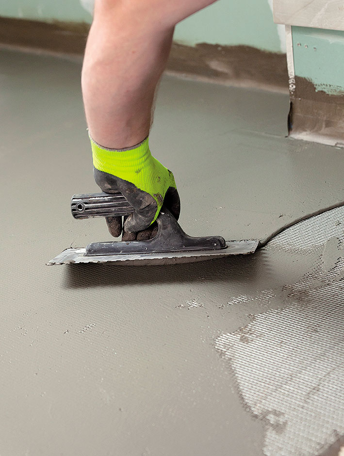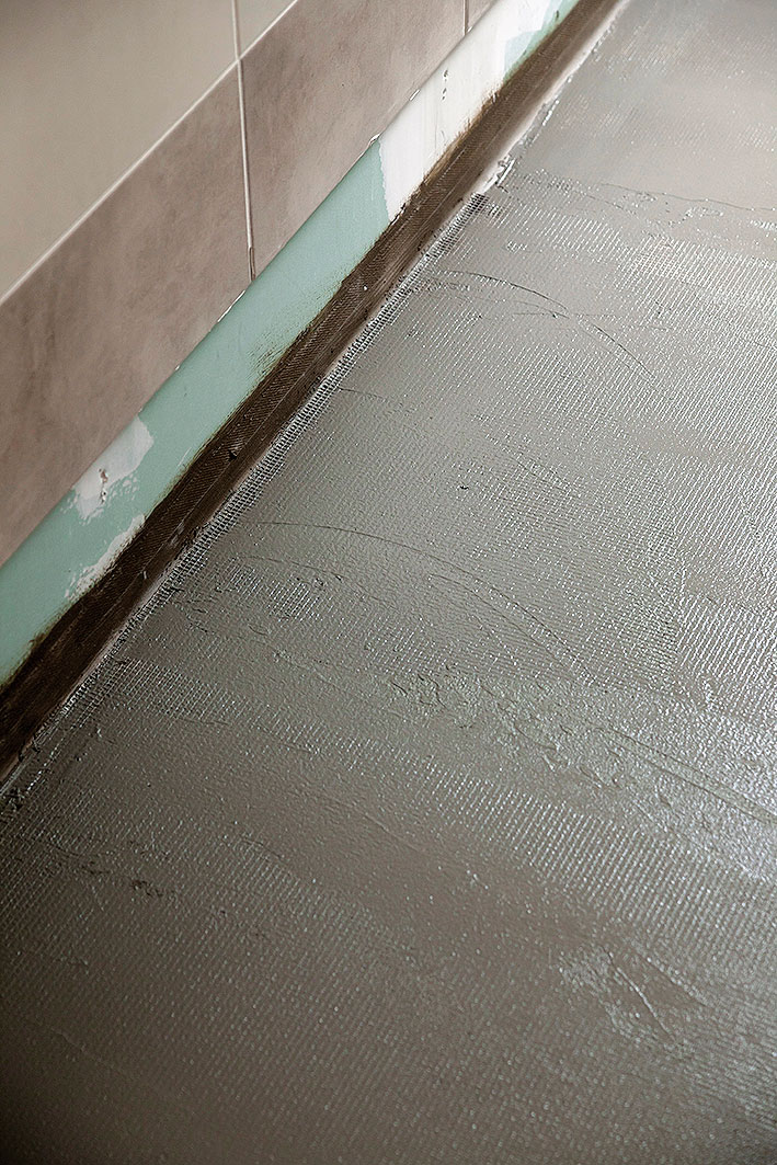 Miesta styku steny a podlahy sa utesnia pogumovanou páskou. Na strany izolovaných rohov a škár sa nanesie tenká vrstva cementovej membrány v hrúbke minimálne 1 mm. Do čerstvej vrstvy sa vloží tesniaci pás a zatlačí sa pomocou hladkej stierky. Celý tesniaci pás musí byť prekrytý vrstvou hydroizolačnej malty.